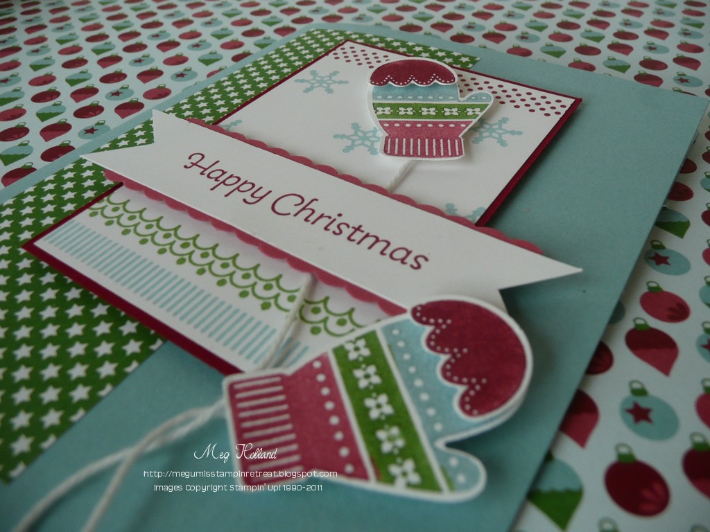 Tools and Accessories – Stampin’ Write Markers (Cherry Cobbler, Gumball Green, Baja Breeze, Primrose Petals), Mitten Builder Punch, Dotted Scallop Ribbon Border Punch, Whisper White Baker’s Twine