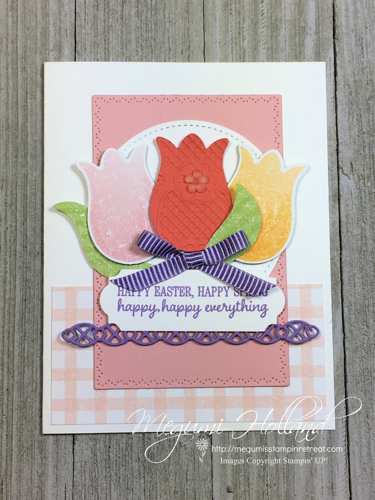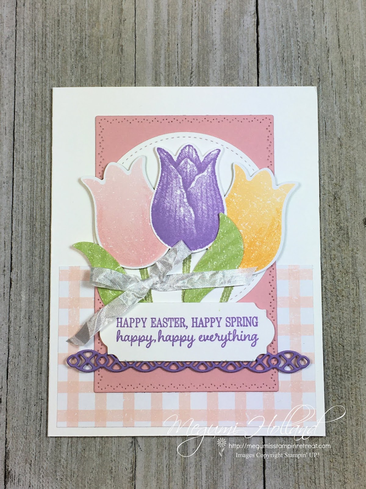 Here is the Step-Up version. Instead of the embossed tulip in the center, I stamped one of the tulip images from the Timeless Tulips Stamp Set. I also stamped the stem images on the circle die-cut from the Stitched Shapes Dies.
