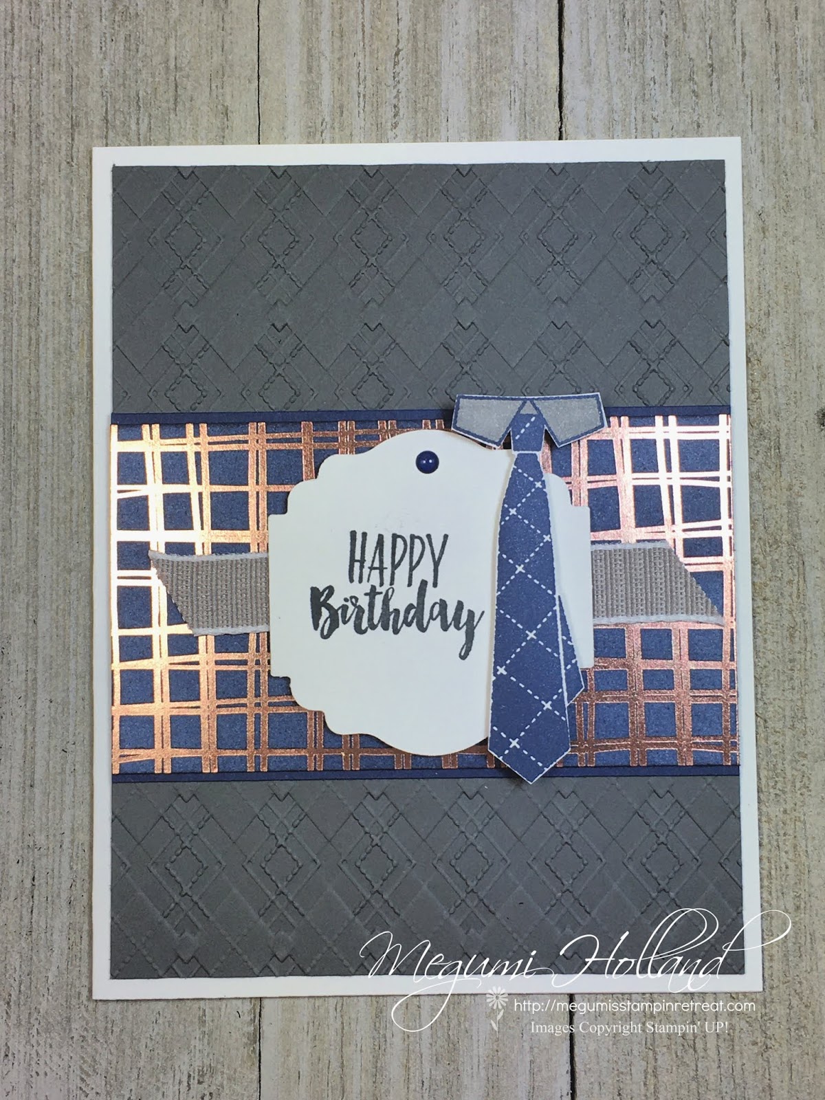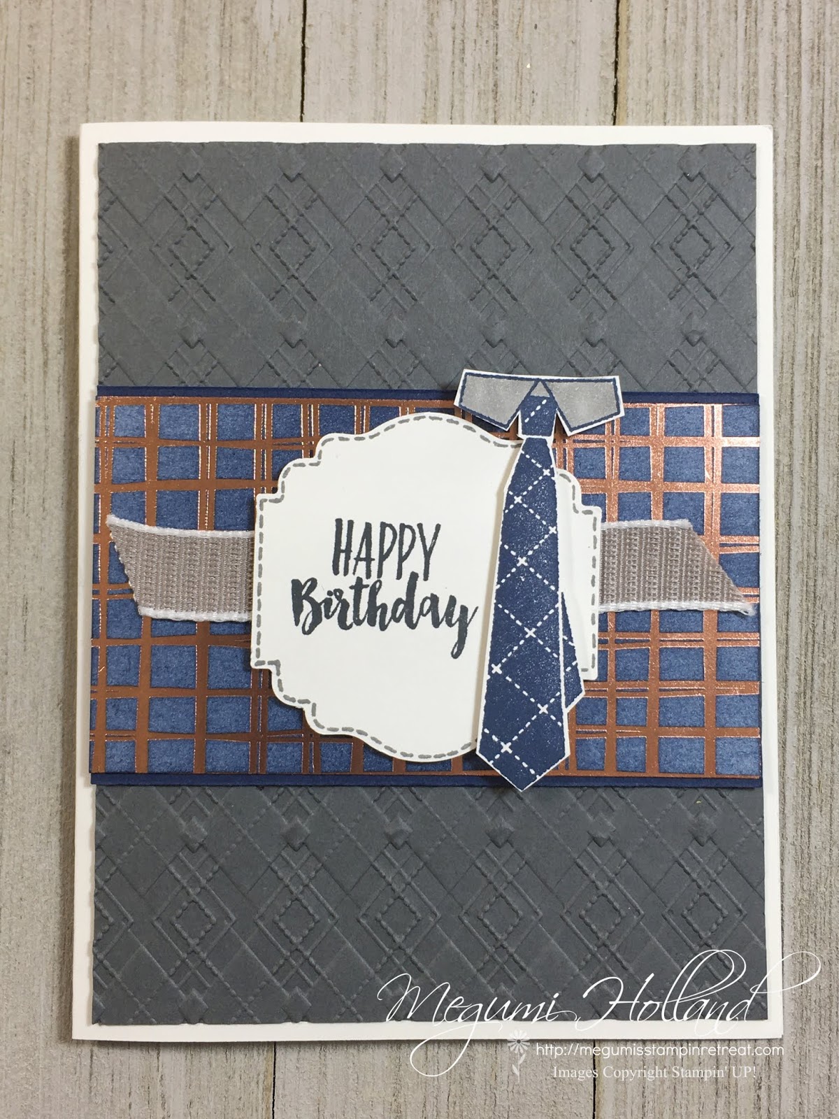 The Well Dressed Stamp Set is a nice manly set of stamps. When you can get it for free with a $50 order, why not? Right? I stamped the tie image with Night of Navy ink and then colored the collar with Light Smoky Slate Blends Marker.