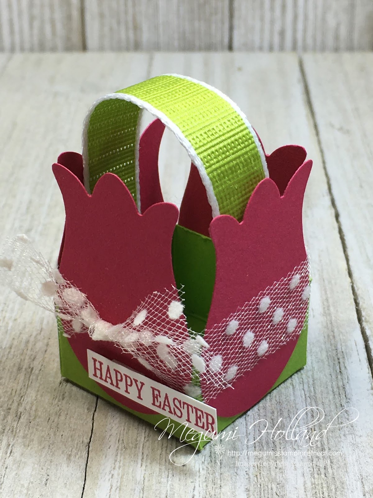 Here is a super quick and fun party favor you can make using the Tulip Builder Punch. I punched out 4 tulips out of Lovely Lipstick Card Stock and adhered to the all four sides of box. The box is cut to 2-3/4″ x 2-3/4″ and scored at 3/4″ on all 4 sides. Make 4 slits on the score lines (2 slits on one side and 2 slits on the opposite side) and fold on the score lines to create a box. Super easy!!!