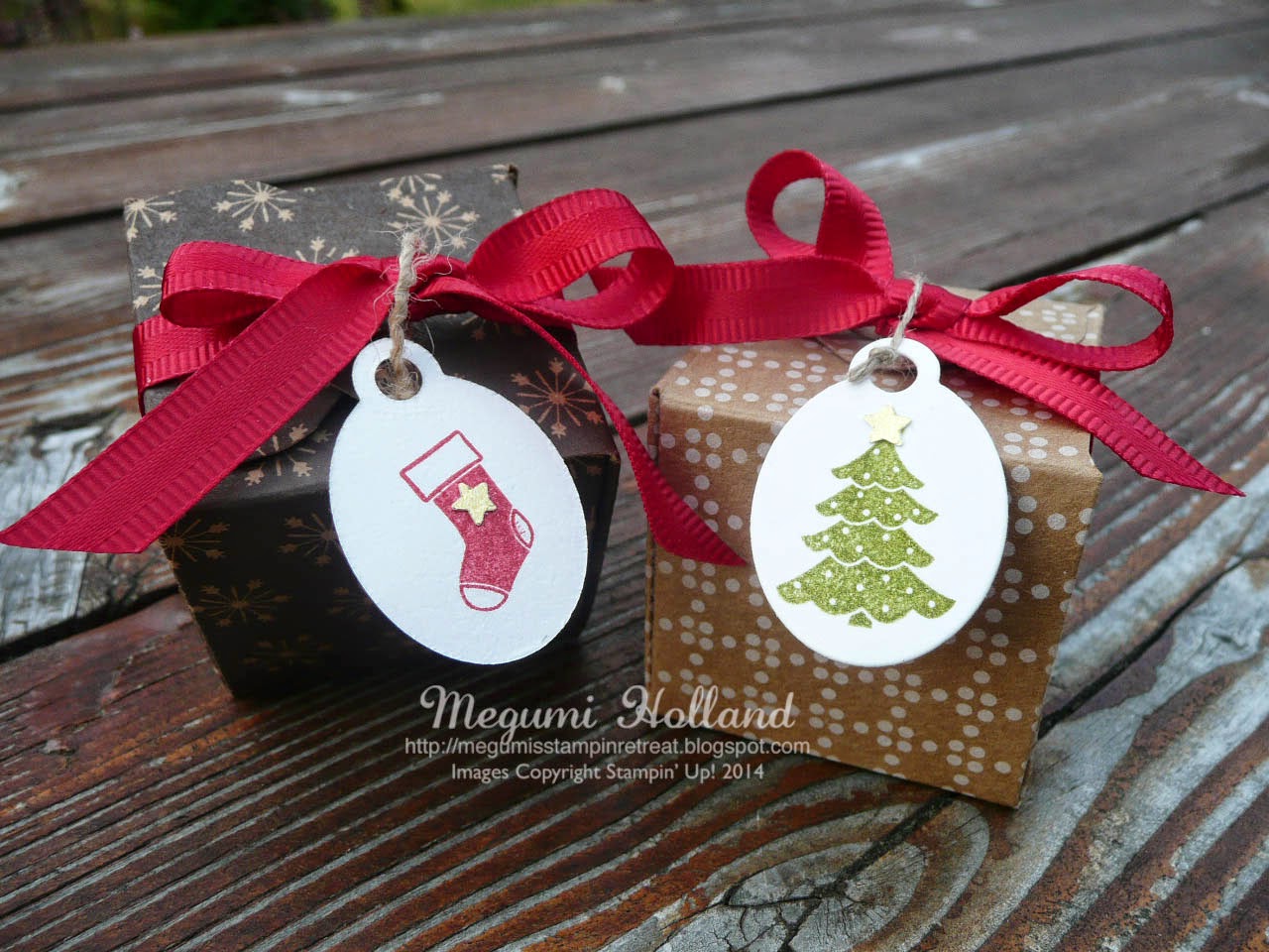 Aren’t these stocking and Christmas tree stamps adorable? They are perfect size to stamp on this tag die cut from the Curvy Keepsake Box Thinlits Dies (page 11 of Holiday Catalog).