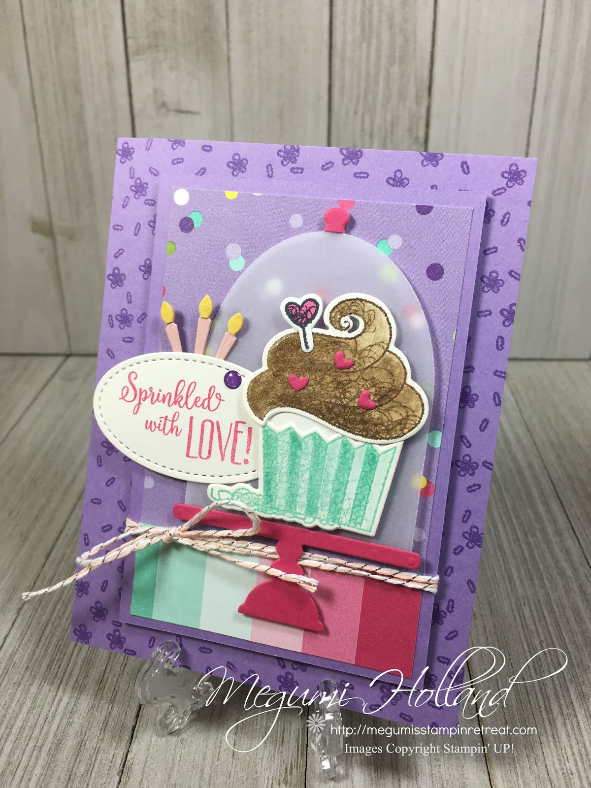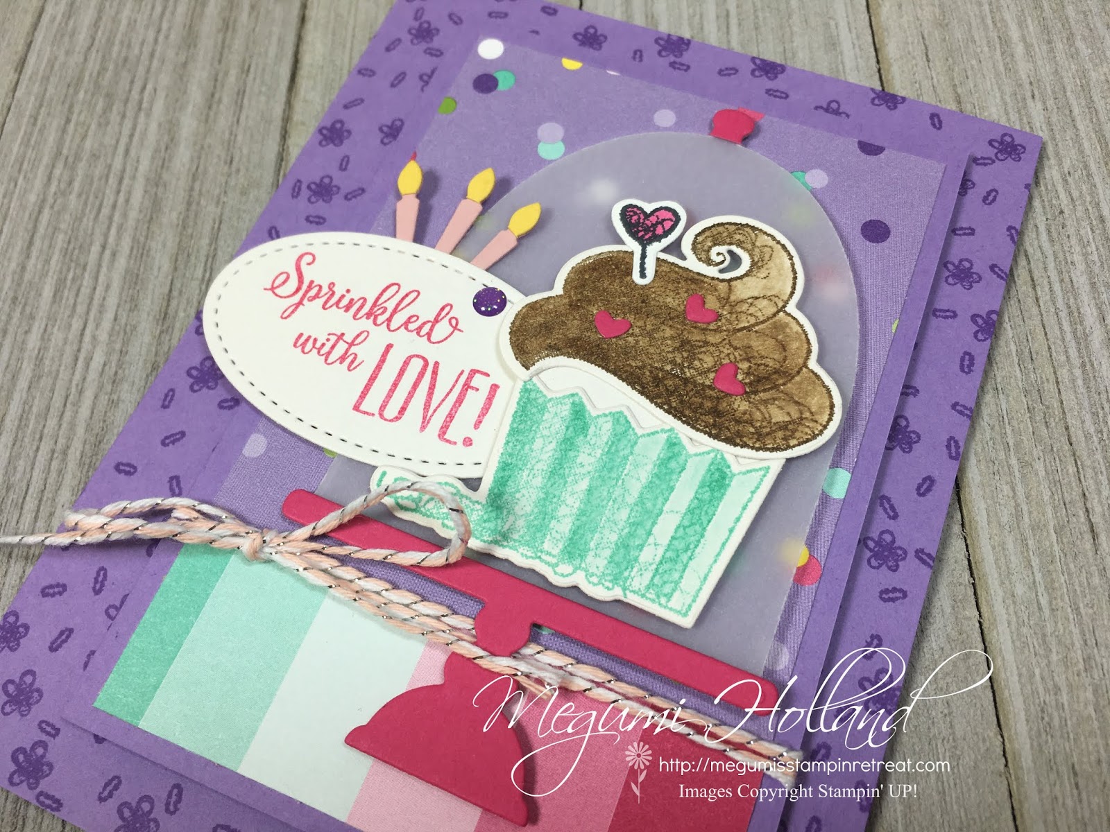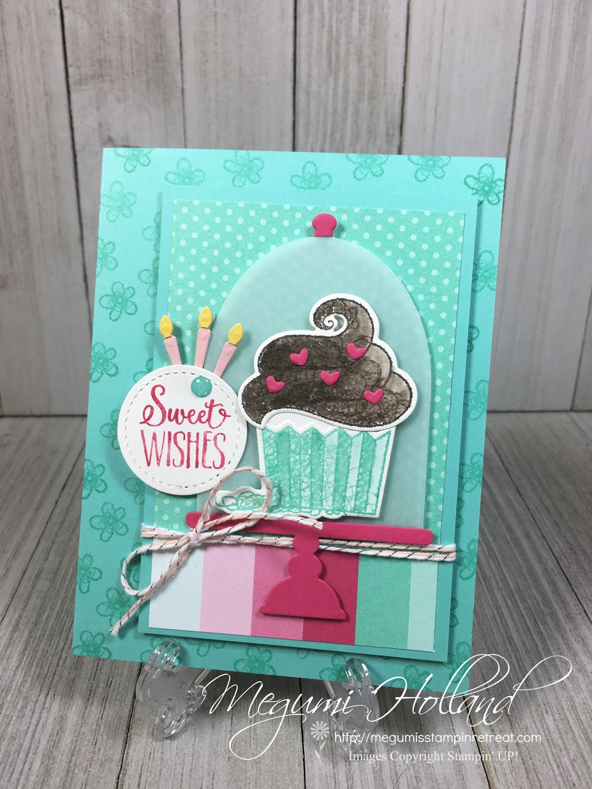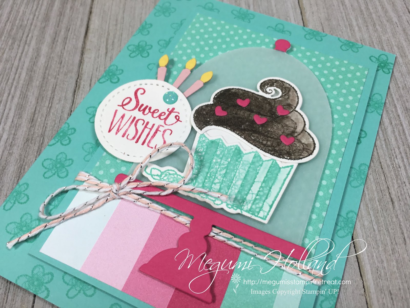 To make my card I used the new Call Me Cupcake Thinlits Dies which will be available for purchase on March 1, 2019 to die cut my stamped images. I also die cut other coordinating shapes from the die set to add more embellishments.